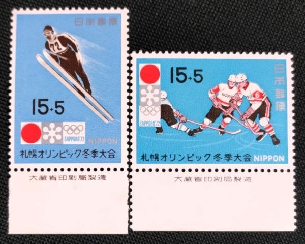 - [24102203]【札幌オリンピック冬季大会記念・寄付金付】単片2種 銘版付「ジャンプ・アイスホッケー」15円(+5円)×2 1971年発行 美品