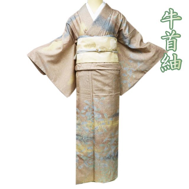 > 特選 牛首紬 着物 中古 袷 セミフォーマル 白山工房 ラベル付き 植物文様 薄茶色 多色 身丈157cm 裄64.5cm M きもの北條 A1101-5