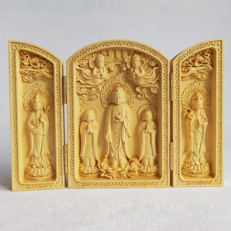- 【柘植仏像】 ◆浄土宗西方三聖像開閉式箱型◆ ナチュラル/天然木製/手作り/ハンドメイド/細工彫刻/インテリア/プレゼント/開運風水厄除け