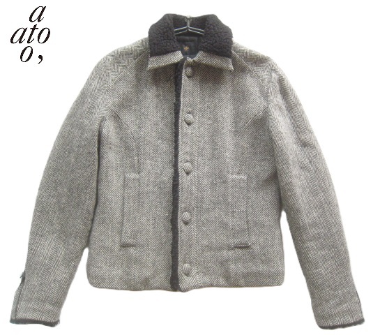 - 極上日本製!!アトウ ATO*ボア襟 ヘリンボーン織り柄ウールツイードZIPジャケット M 黒×白