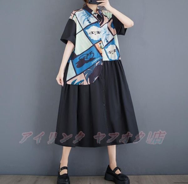 - ☆新品F シャツワンピース きれいめ プリント柄 切り替え 半袖 着痩せ 大人 ロングシャツ マキシワンピース ブラック