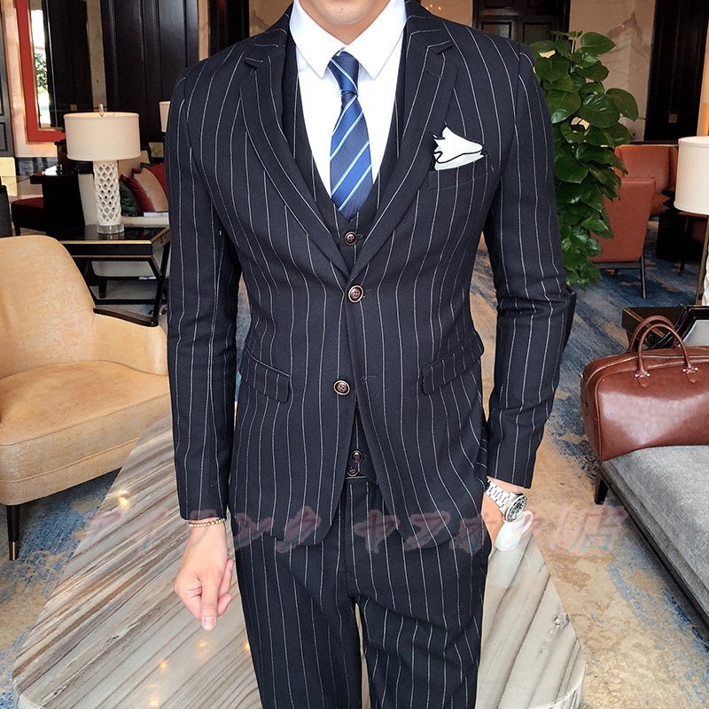 > ☆新品スリーピース スーツセット ストライプ柄 メンズ 結婚式 3点セット スタイリッシュ 二つボタン 細身スリム 微ストレッチ 黒 S~4XL