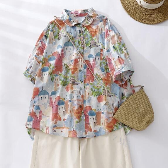 - ☆新品カジュアル ゆったり 綿麻風 シャツ ブラウス 半袖 リネン プリント柄 トップス おしゃれ リネンブラウス 通勤 薄手 可愛い
