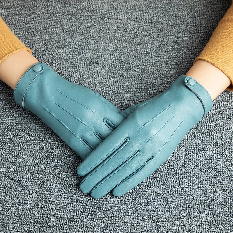 - 新品☆3色選択可レディース 女性用 手袋 ショート レザー 羊革 スマホ対応手作り 通勤 運転 裏起毛防風 手ぶくろ 防寒 撥水 自転車 ブルー