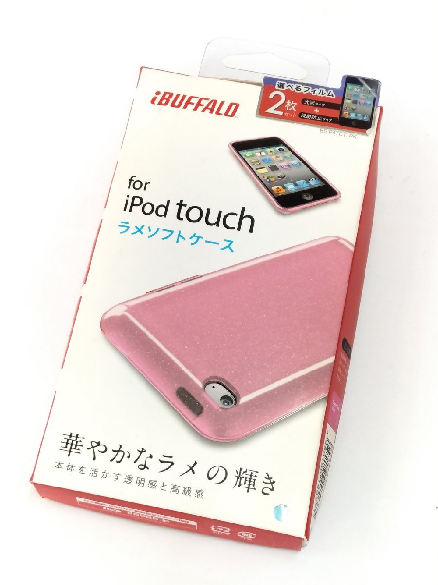 iBUFFALOが販売していた iPod touch2010/2011年モデルのソフトケースです。カラーはラメ入りピンク、保護フィルムは光沢タイプと反射防止タイプの2枚付きです。
