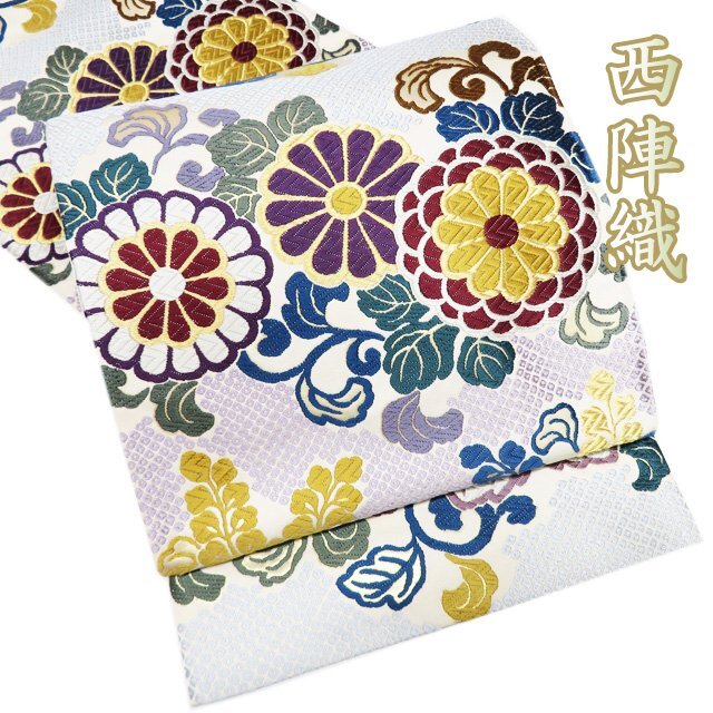 > 袋帯 中古 リサイクル フォーマル 仕立て上がり 六通 西陣織 ラベル付き 錦宝菊桐文 箔糸 灰白色 多色 金 きもの北條 A1105-9