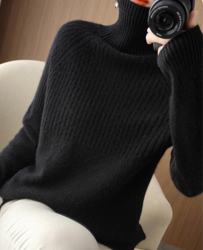 - 秋冬*オレンジ ニットセーター 長袖 通勤 ハイネック ニットソー カシミヤ混 暖かい 大人 着痩せ 上品 ショート丈 ニットトップス*ブラック