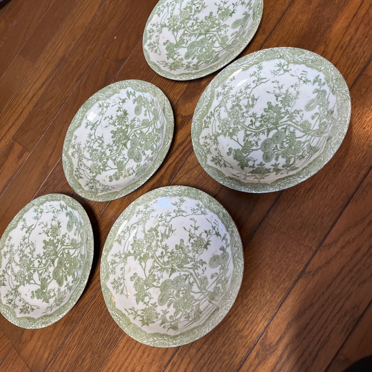 > レア 明治印判大皿五枚セット グリーン 変わった素敵な絵で食卓を華やかに 最終処分特価