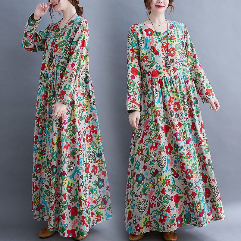 - OHJ296★秋新品☆ゆったり大きいサイズ☆カジュアル体型カバー☆プリント柄☆綿麻☆20304050代☆長袖☆ロングワンピース☆Lサイズ