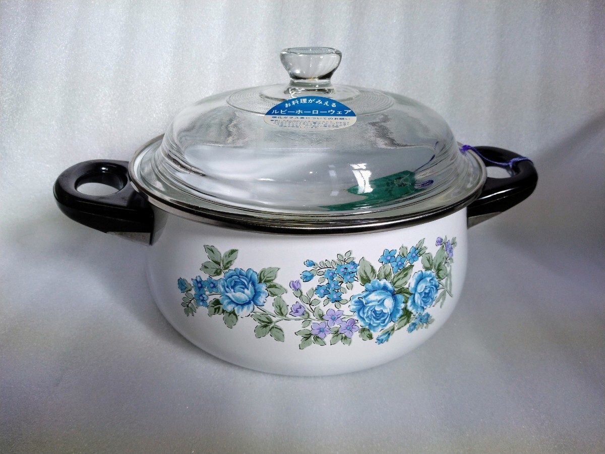 - K629【未使用】 ルビーホーローウェア 20cm 両手鍋 花柄 昭和レトロ