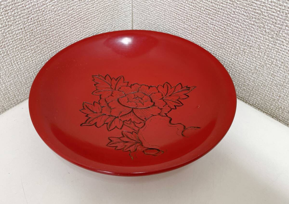 - 【村上堆朱 木彫り 菓子器】盛皿/伝統工芸/直径21cm/ボタンの花/漆器/飾り皿/A611-142