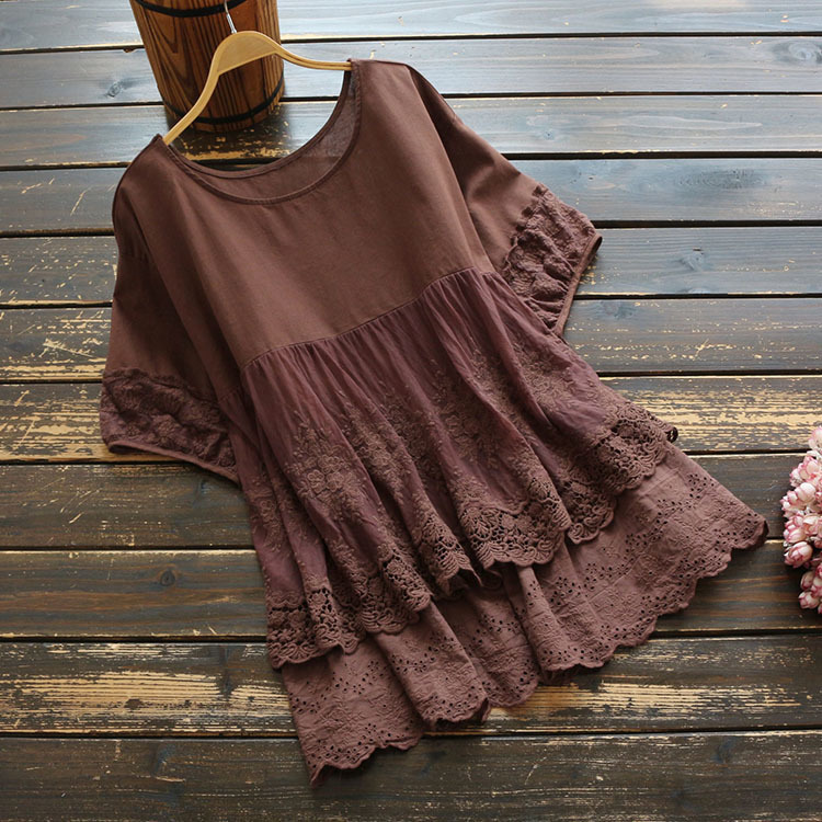 - 2021年 新デザイン 夏婦人服 文芸 網刺 半袖 上着 中長款 頭シャツ人形衫 コーヒー色YWQ649