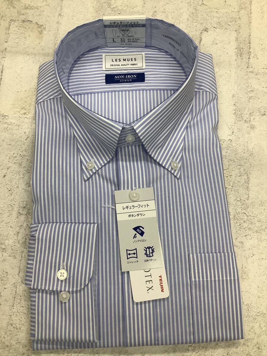 - 新品未使用★41-86長袖Lサイズ ★サックスブルー×白 ストライプ柄、ボタンダウン定価4,990円 ノンアイロン 綿ポリ
