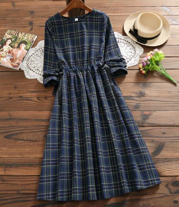 - オシャレ チェック柄 綿麻 リボン 着痩せ 長袖 ロング丈ワンピース YWQ469