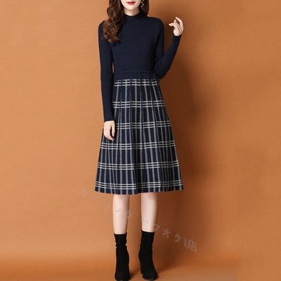 > ☆新品春M-XLサイズ秋冬上品大人カシミヤ混304050代気質園行事ストレッチ暖かいニットセーターひざ下丈ワンピースドレス紺