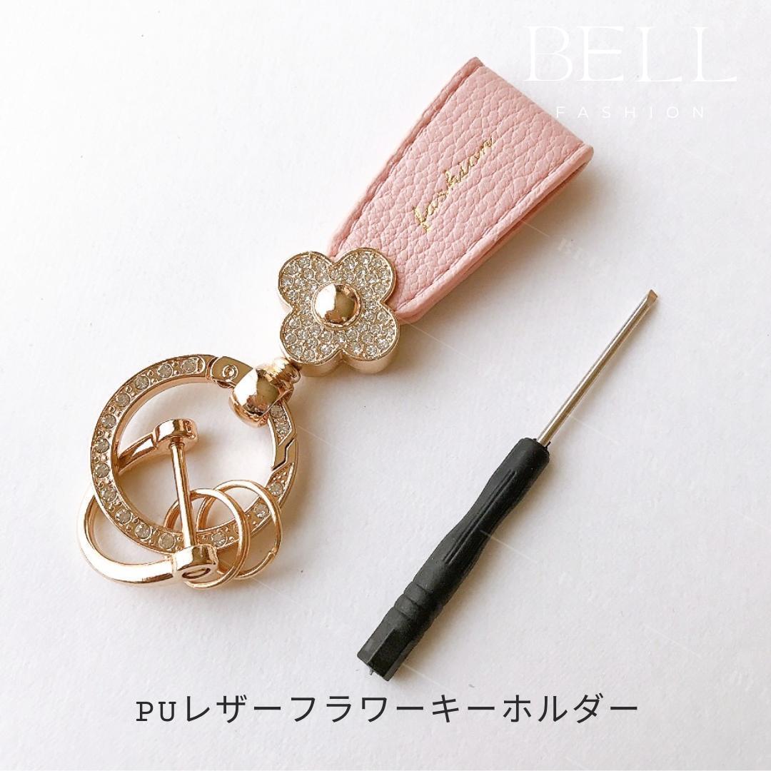 - 7938★キーホルダー★車★ゴールド★ラインストーン★花★革★ピンク★かわいい