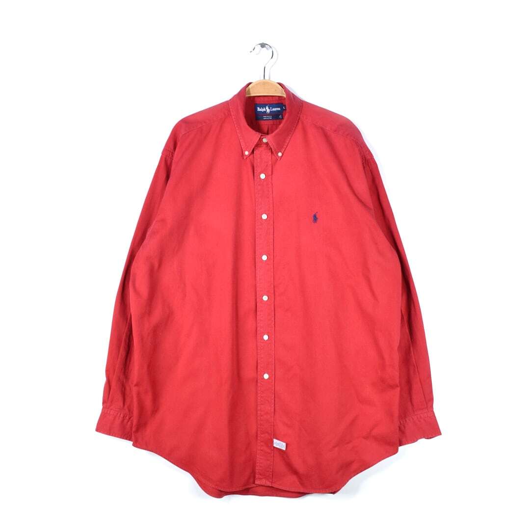 - 【送料無料】80s ラルフローレン USA製 オックスフォードシャツ ボタンダウン レッド RALPH LAUREN メンズL 古着 @CA1405