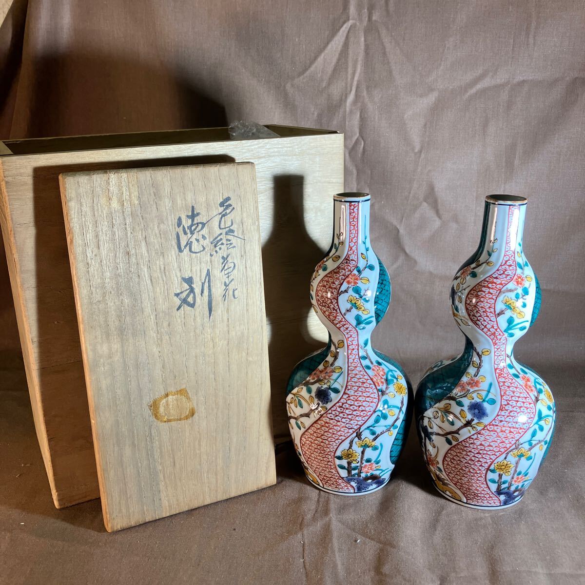- 三代為吉(三ツ井詠一)造 色絵菊花徳利 徳利 酒器 九谷焼 共箱 陶暦