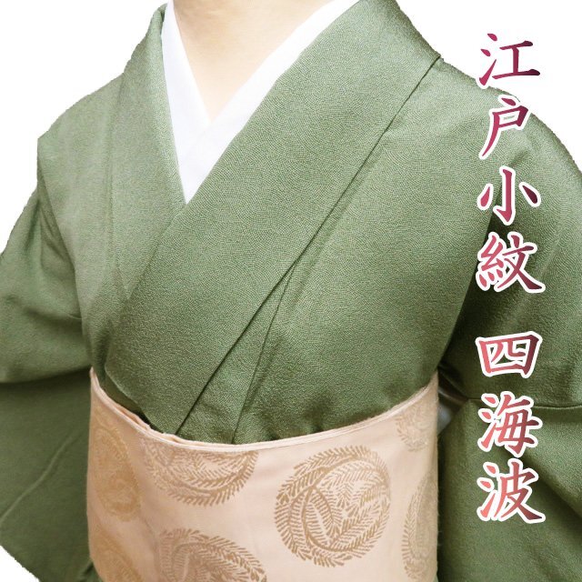 - 小紋 江戸小紋 着物 中古 袷 セミフォーマル 紋付き 作家物 青海波 四海波 反端付き 草色 身丈167.5cm 裄68cm L トール きもの北條 A1116-3
