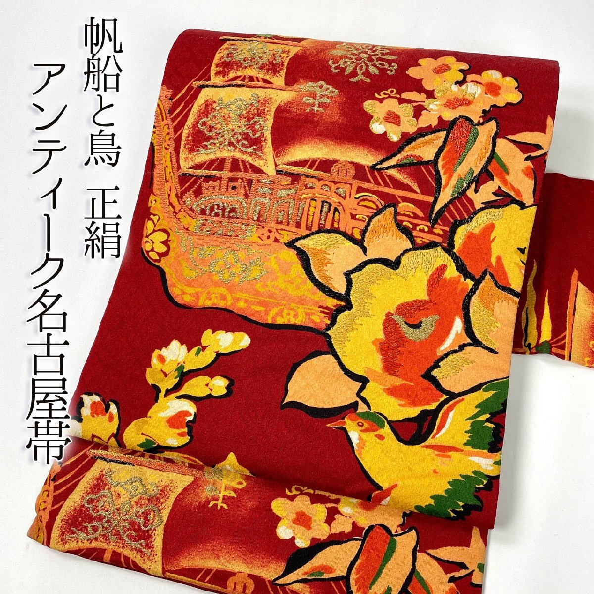 > 着物さと 美品 希少 個性的 アンティーク 名古屋帯 正絹 帆船 鳥 花 赤 黄色 緑 金糸 和装 和服 大正浪漫 大正ロマン