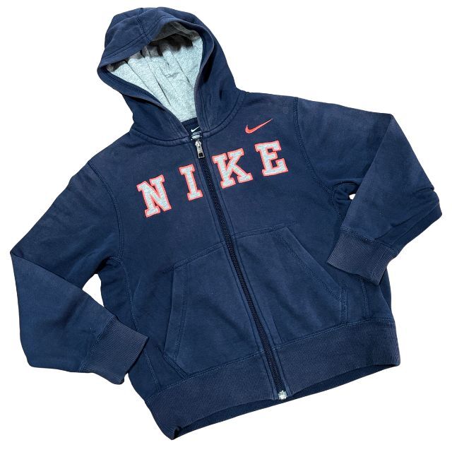 - ナイキ ビッグロゴ デカロゴ スウォッシュ 刺繍 ジップパーカー キッズ140 NIKE フード裏コットン フェード 色褪せ vintage 雅瀬1085