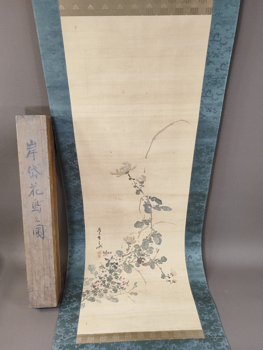 - k10 岸岱 花鳥図 肉筆 掛軸 絹本 模写