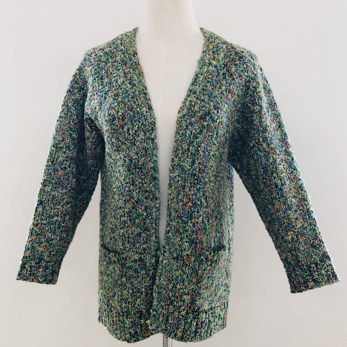 - YAS0344 レディース アウター カーディガン 七分袖 襟なし ノーカラー サイドポケット 留め具なし グリーン 緑 カラフル 昭和レトロ 秋冬