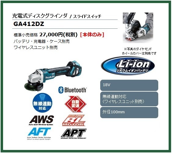 > マキタ 100mm 18V 充電式ディスクグラインダ GA412DZ (本体のみ) [スライドスイッチ] 【ワイヤレスユニット別売】 ■マキタ純正/新品■