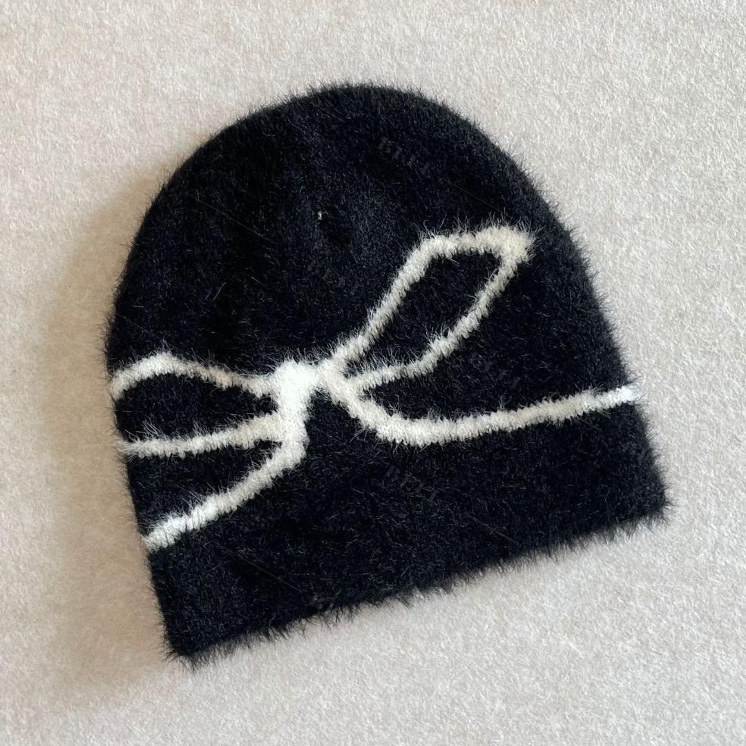 - ニット帽★リボン★ブラック★韓国★かわいい★流行★秋冬★モヘア★あったかい★安い