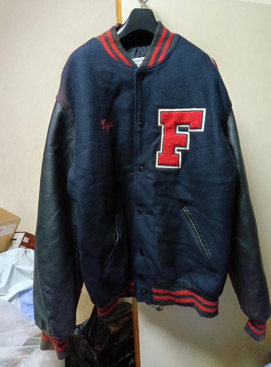 > 送料無料 古着 希少 ビンテージ 袖レザー アワード バーシティ ジャケット XL 濃紺×黒革 スタジャン スタジアム ジャンパー AWARD VARSITY