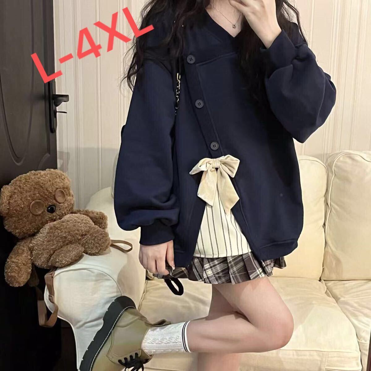 - トレーナー レディース 大きいサイズリボン付き Vネック 春秋 冬 オーバーサイズ ロング長袖 裹起毛 トップスカジュアルLUFA250(L-4XL)