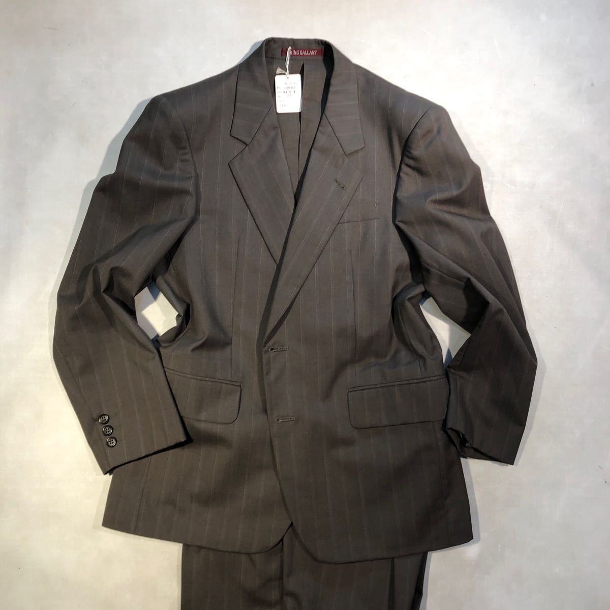 - 新品☆★タグ付き訳あり高級KING.G日本製ビンテージ2つボタンスーツセットアップ サイズAB4 オリーブ系ダブルピンストライプ ウール100%