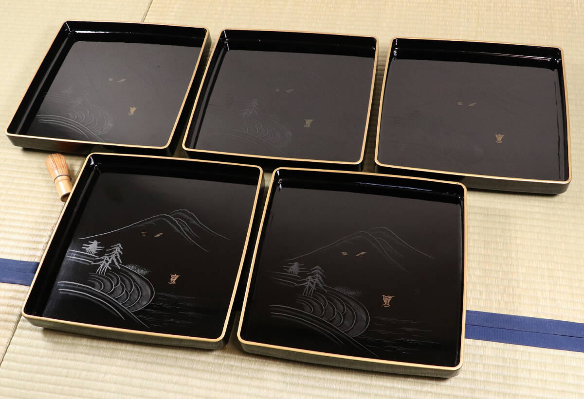 - 木曽漆器 丸庄謹製 山水図 沈金銀 足付 黒塗膳 五客 木製漆器 四方膳 懐石膳 会席膳 MA304