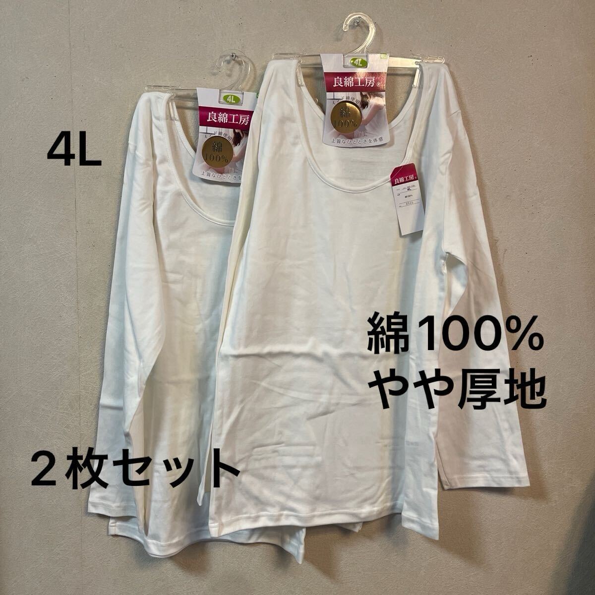 - 2枚組 婦人 肌着 レディース インナー 長袖 シャツ Tシャツ 4L 綿100% やや厚地 スムース編み オフホワイト 女性用