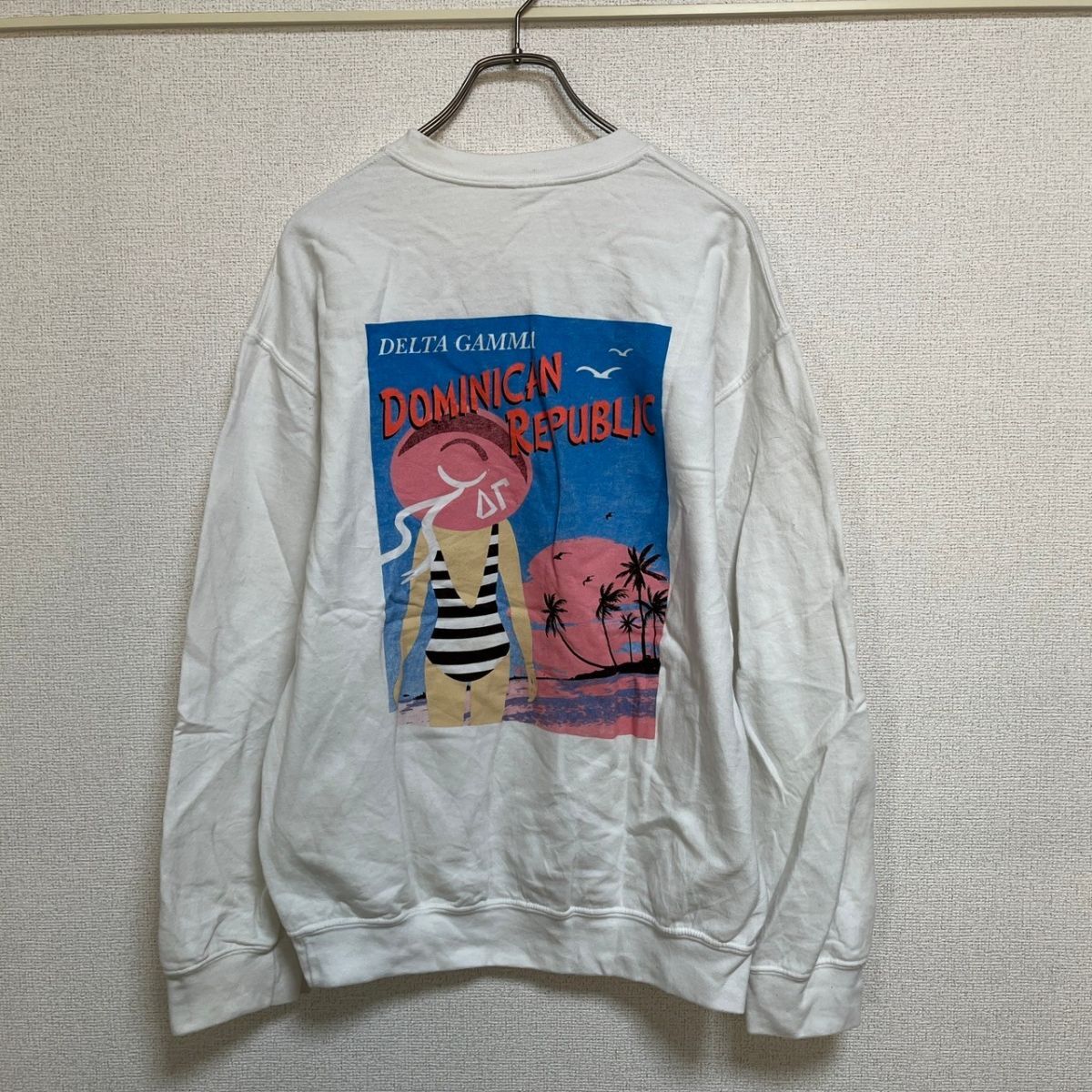 - ヤシの木 スウェット 夕日 白 セクシー女性 麦わら帽子 ドミニカ共和国14 古着 入手困難 激レア 希少 人気 アート ホワイト