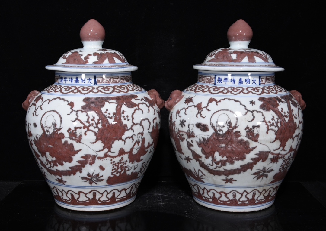- ◆旧家蔵出◆古美術 中国古玩 大明嘉靖年製款 釉里紅 羅漢紋盖罐―對 古賞物 擺件 骨董 時代物 AT08