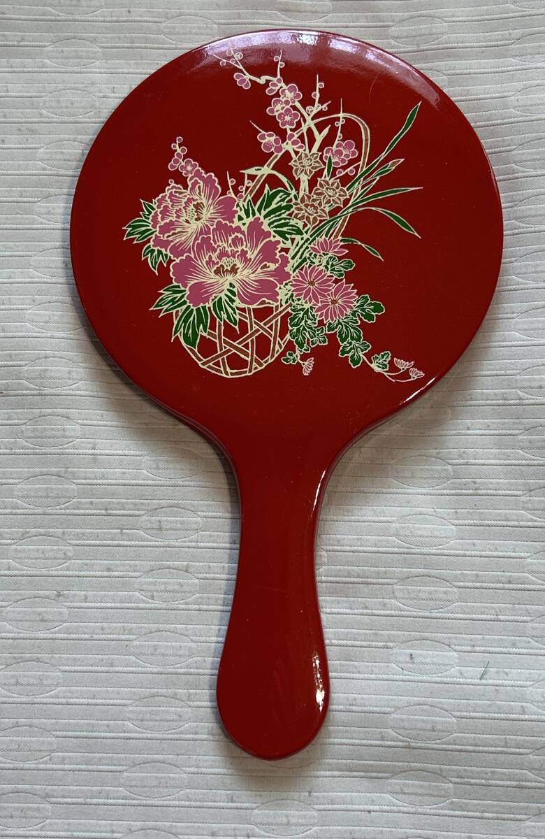 - 手鏡 あわせ鏡 古い昭和レトロ品 伝統工芸 塗り細工 花模様インテリアにどうぞ■■未使用箱付き