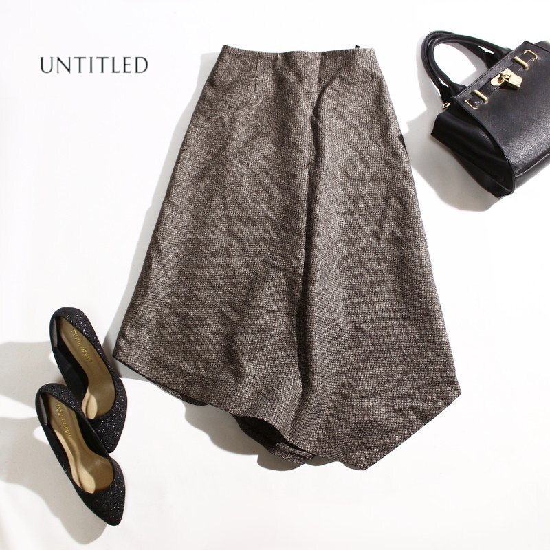 - 美品 アンタイトル UNTITLED 株) ワールド 冬 ミモレ アシンメトリー デザイン ミックスウール フレアスカート 9号 2 ダークブラウン 白