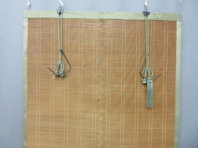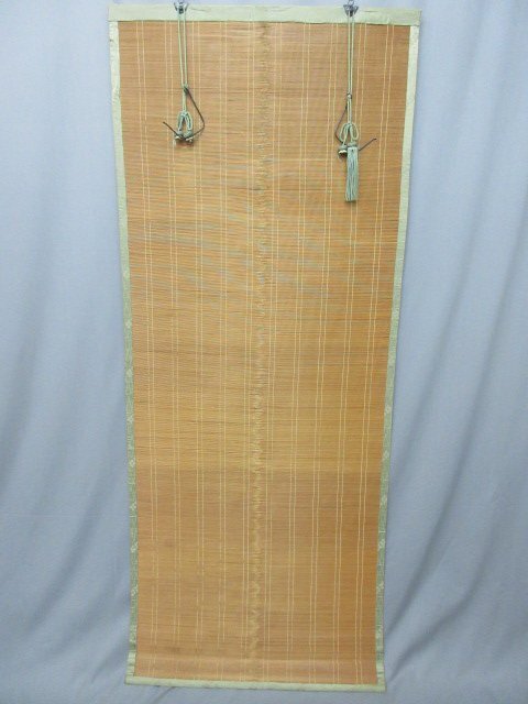 御簾 1枚です。寸法は縦175cm、横71cmです。房が無いところがありますが、他の状態は良いと思います。120サイズ、ゆうパックで発送を予定しています。商品画像が実際の商品そのものですので、ご入札前にしっかりとご確認いただきますようお願いいたします。タイトルと画像が異なる場合、当方のミスの可能性がありますので、お手数をおかけしますが、その際にはご連絡いただければ幸いです。また、気になる部分や詳細な画像が必要な場合は、質問からお気軽にご連絡ください。配送方法については、通常の配送にはゆうパックやクロネコヤマトを利用します。大型商品や重量のある商品には、西濃運輸、佐川急便を選択することがあります。軽量で壊れにくい小物には、クリックポストやレターパックを利用することもあります。同梱の場合は送料が変わることがある点、ご了承ください。商品の写真はデジタルカメラや照明、撮影環境により実物の色と異なる場合があります。「真作」とタイトルにある商品について、万が一真作でない際には返品を受けます。中古商品であるため、記載しきれない経年劣化や時代の汚れ、傷みなどがある場合がございます。十分なご理解をいただいた上で、ご入札いただけますと幸いです。皆様のご入札を心よりお待ちしております。他にも色々出品中ですので是非ご覧ください。