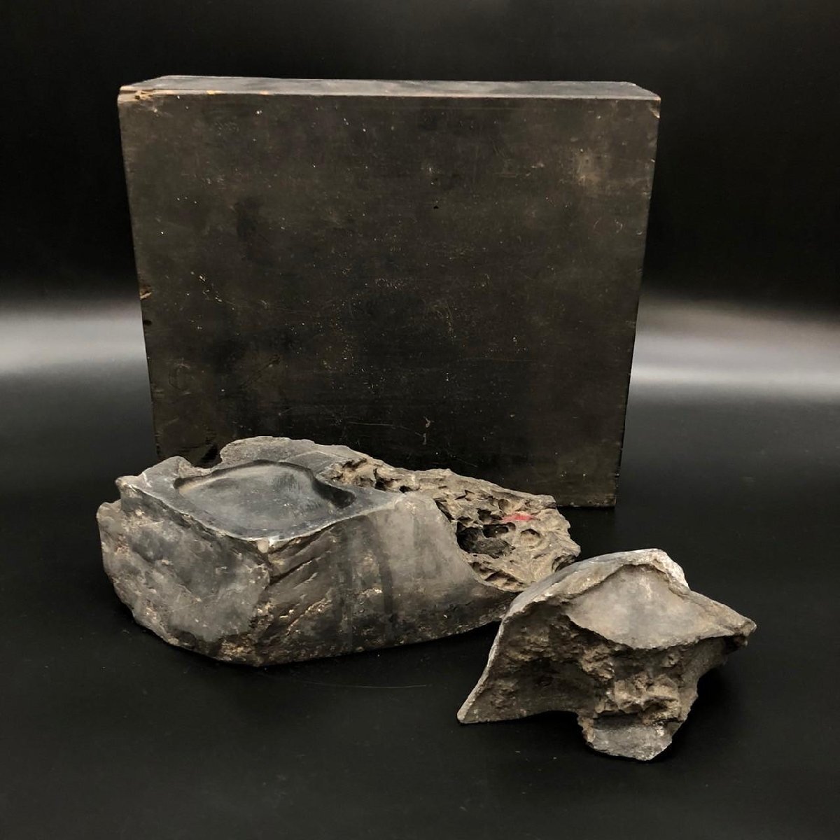 - SW1204-6-4 硯 書道具 美術品 彫刻美術 天然物 赤いシミ有 文房具 石製 3㎏ 文房具 箱有 オブジェ 26×15×8㎝ 80サイズ