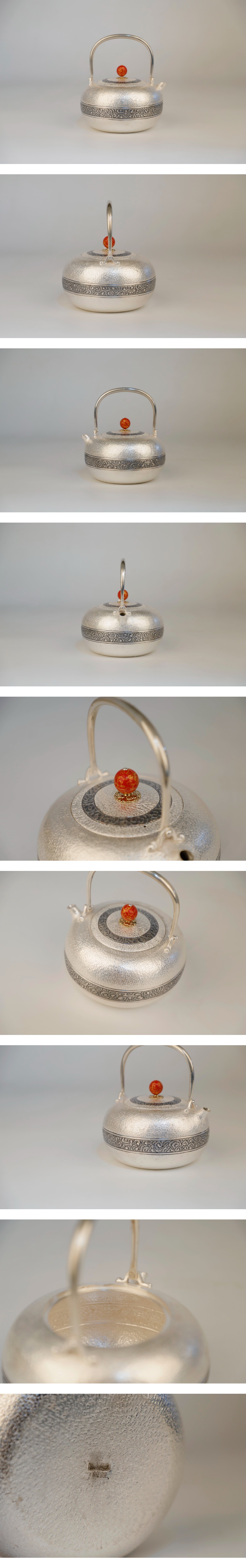 - 時代 純銀製 龍文堂造 雲文彫り 丸形赤玉摘み 湯沸 工芸品 古美術品 銀瓶 煎茶道具