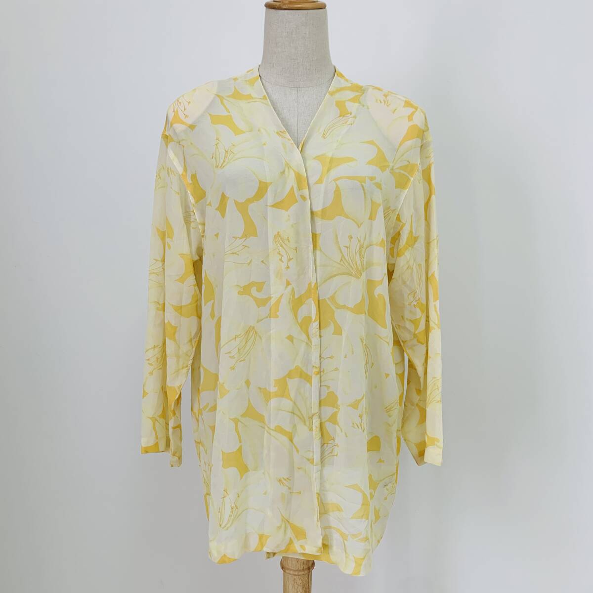 - YH2190 SAISON DE ELLE レディース 総柄 ボタンレス カーディガン 薄手 透け感 肩パッドあり イエロー 黄色 Lサイズ 万能 USED 古着