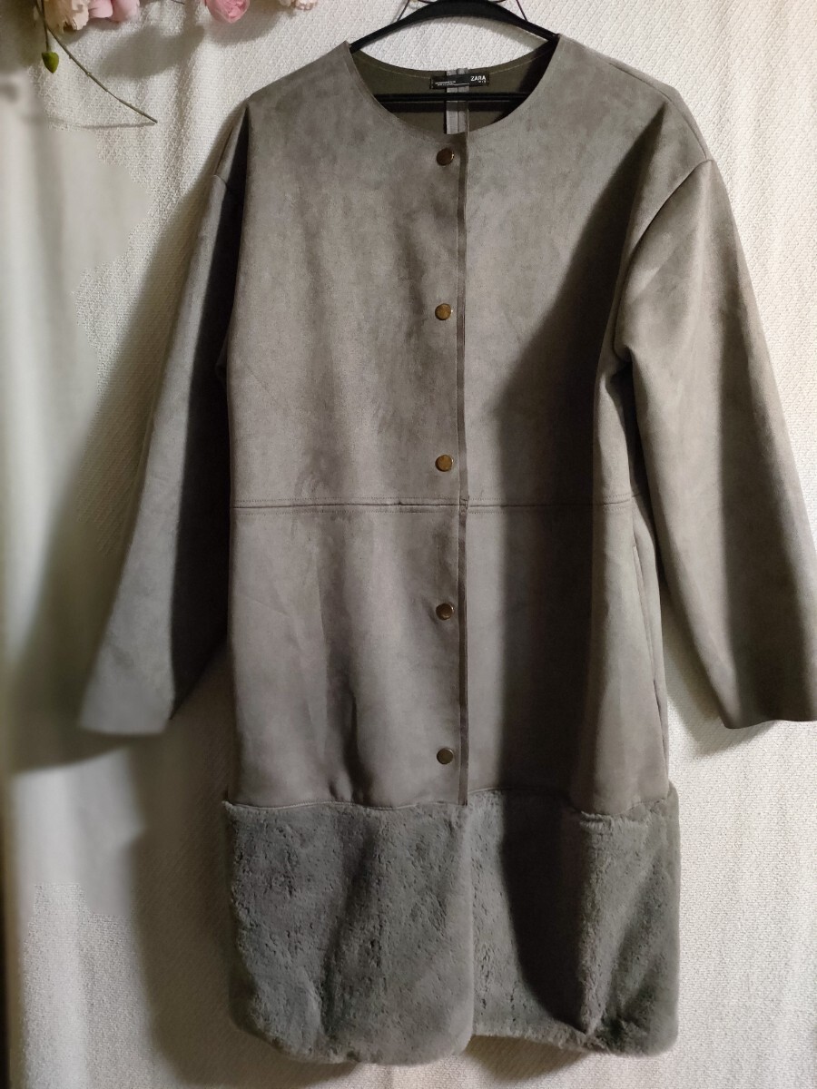 - ② ZARA ノーカラー コート モダンファー切り替フェイクスウェード グレー系