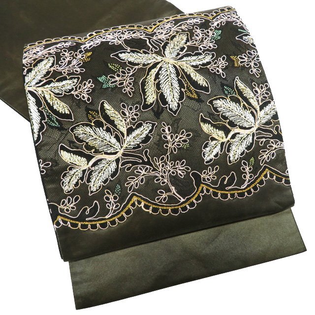 - 袋帯 中古 リサイクル 正絹 フォーマル 仕立て上がり お太鼓柄 相良刺繍 植物文様 箔糸 媚茶色 多色 きもの北條 A1130-11