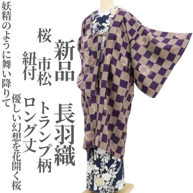 - tomihisa 新品 桜 市松 トランプ柄 紐付 着物 正絹 仕付け糸付 ロング丈“妖精のように舞い降りて優しい幻想を花開く桜”長羽織 4947
