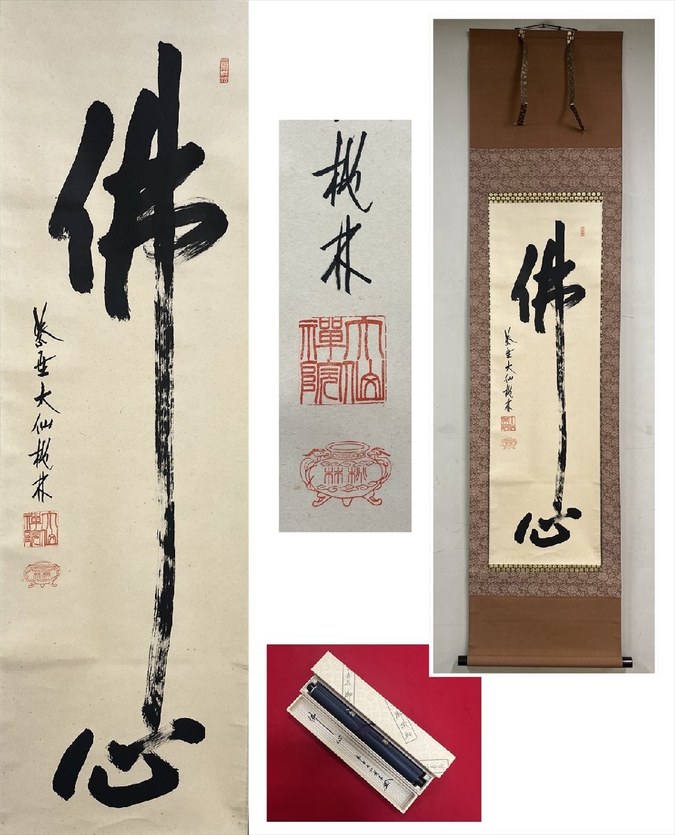> 【千寿】大徳寺派 大仙院 大仙桃林(尾関宗園) 佛心 自筆 一行書 紙本 d1051◆在銘 箱 茶掛 掛軸 掛物 茶道具 100033035