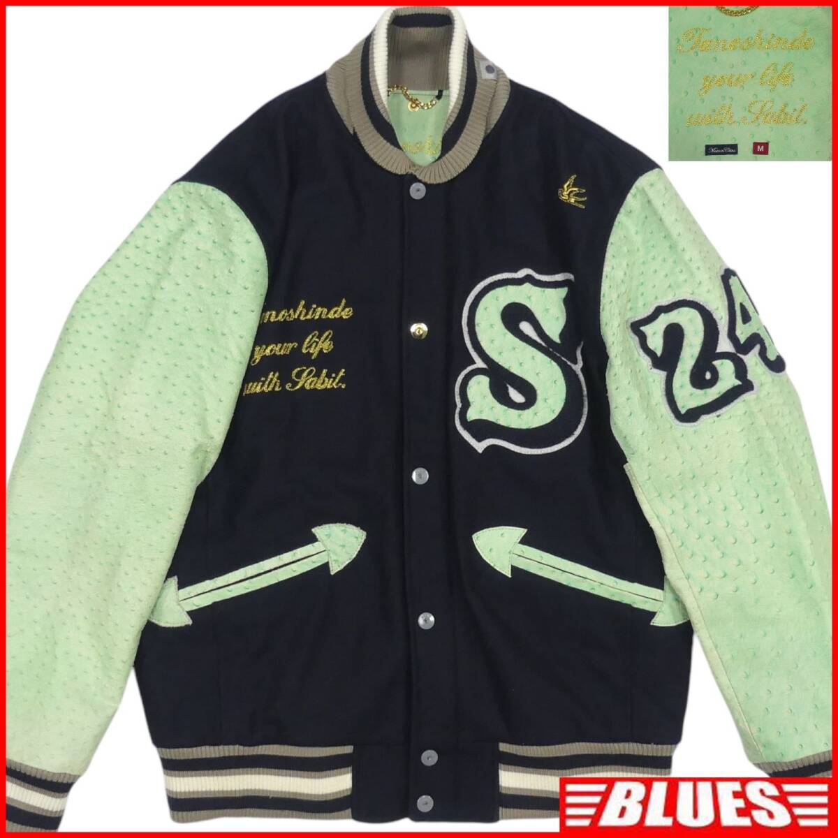 - 即決★SABIT★メンズ M レザーアームスタジャン サビット 黄緑 黒 オーストリッチ型押し 本革 ブルゾン 本皮 ジャンパー 革ジャン