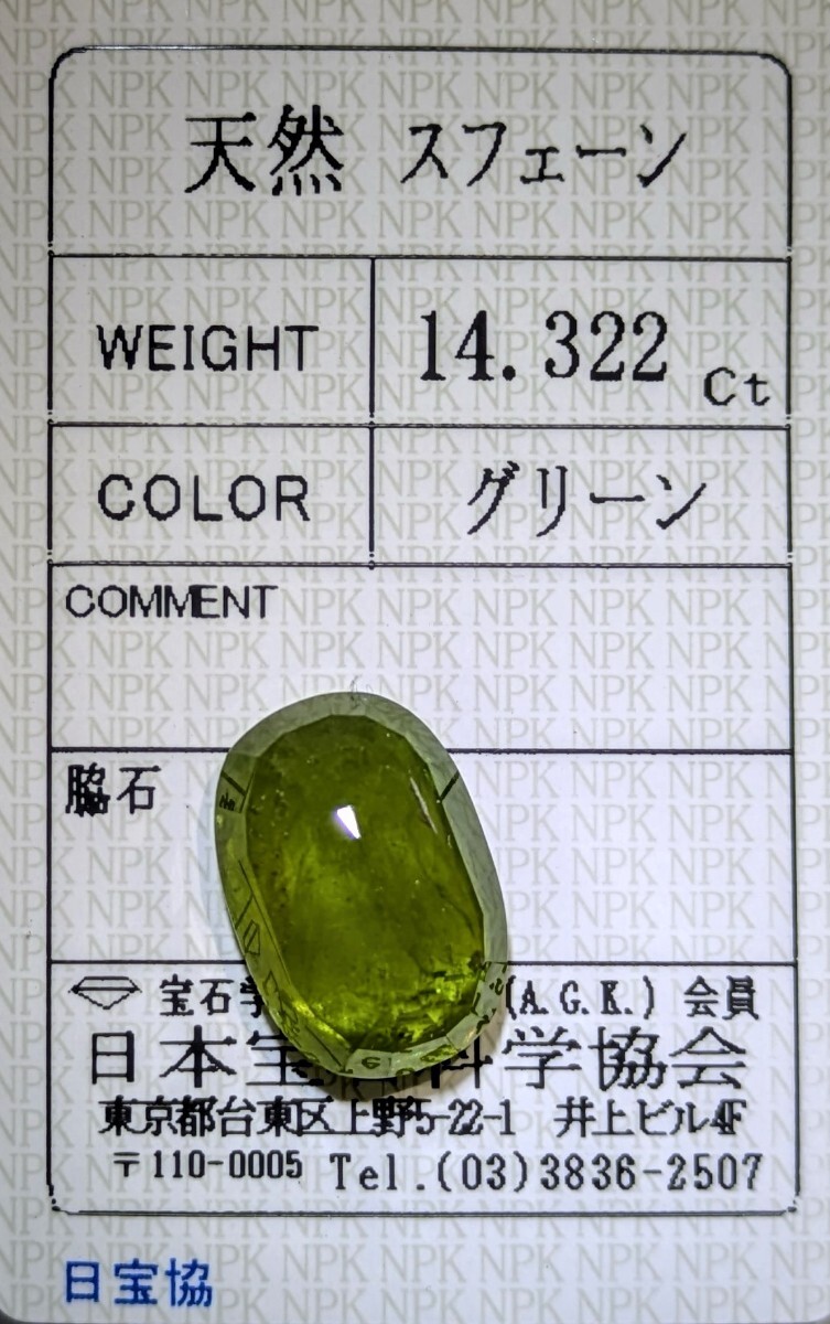 - 超特大!希少宝石 烈光の天然スフェーン 14.322ct ルース 裸石 パワーストーン お守り 宝石 天然チタナイト ソーティング付き jewelry