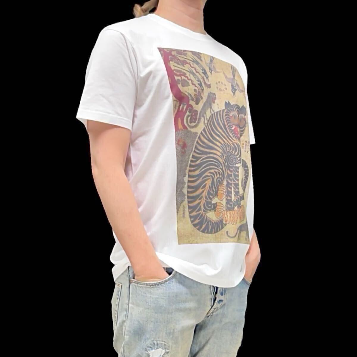 > 新品 ビッグプリント 朝鮮民画 19世紀ヴィンテージ レトロ 韓国 魔よけ絵 アジア アート 虎図 トラ タイガー Tシャツ ユニセックス Lサイズ