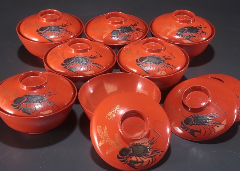 ■【夢讃岐】木製漆器 海老盛蒔絵・螺鈿 吸物椀 7客揃(蓋10枚)Φ120 H55 wa624 ■ 商品詳細 御覧頂き、ありがとうございます。 【夢讃岐】木製漆器 海老盛蒔絵・螺鈿 吸物椀 7客揃(蓋10枚)Φ120 H55 wa624 ○商品状態○経年あります。状態の良い品。椀7客揃(蓋10枚)。 状態に関しては,充分に画像で確認の上、クレームの無い様に御入札下さい。 ○サイズ○ Φ--mm/高さ--mm ぐらい表題・画像参照ください。 ○御一読下さい○2025年で、昭和100年です。私共の扱う品は、大半の物が半世紀から一世紀以前の品です。新品と表記しない限り,確実に経年有りますので, 新品とは違い、擦れアタリ等は有るとお考え下さい。 また細かい見落とし等も時代古物とお考えの上御容赦下さい。 気になる箇所は、画像にもアップ致しますので、ご了承の上御入札下さい。 記載・画像掲載されてない,見落としに関しては、常識の範囲で誠意対応致します。 他にも漆器をメインに出品しておりますので、ぜひ御覧下さい 。
